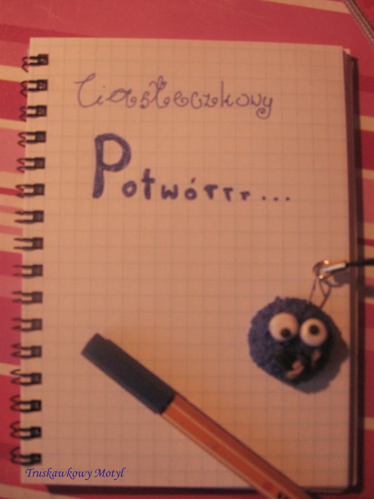 Na tak już nie życiowo tylko modelinowo to dzisiaj znów breloczek. Tym razem ciasteczkowy potwór. Lakierowałam go klejem i lakierem do decoupage w jednym. To dlatego jest taki "mleczny". A poza tym tego specyfiku nałożyłam za dużo ( po prostu go w tym znużyłam)